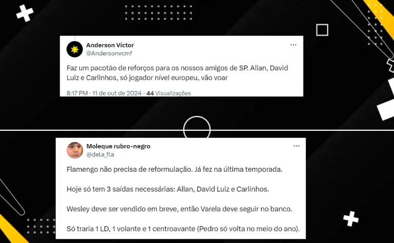 “Faz um pacotāo de reforços para os nossos amigos de SP. Allan, David Luiz e Carlinhos, só jogador nível europeu. Vão voar”, disse um torcedor flamenguista na rede social do X sobre o trio.