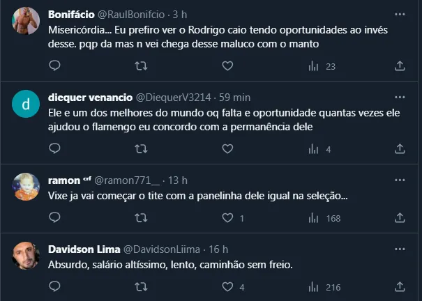 Vale ressaltar que, diferentemente do que a torcida pensa sobre Éverton Ribeiro e Bruno Henrique, David Luiz não goza de grande prestígio e sua possível saída já vinha sendo “comemorada” por parte da Nação. Até por isso, ao descobrirem a sobrevida trazida por Tite, alguns torcedores foram às redes sociais manifestar o seu descontentamento