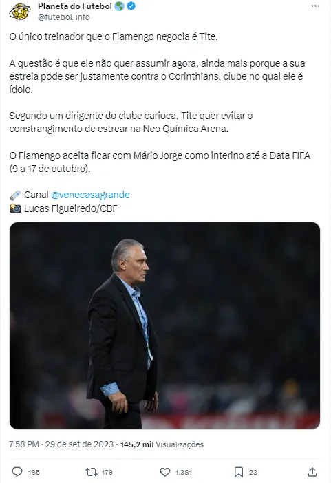 Isso porque do atual elenco do Flamengo, cerca de 11 atletas trabalharam com Tite na Seleção Brasileira. Por mais que nem todos estejam com a situação definida para seguir no elenco em 2024, alguns nomes ainda não alcançaram uma sequência positiva no Rio de Janeiro. Além de ter a oportunidade de devolver na próxima temporada a autoestima perdida pela Nação em 2023, o professor ainda aparece como esperança de parte do grupo.