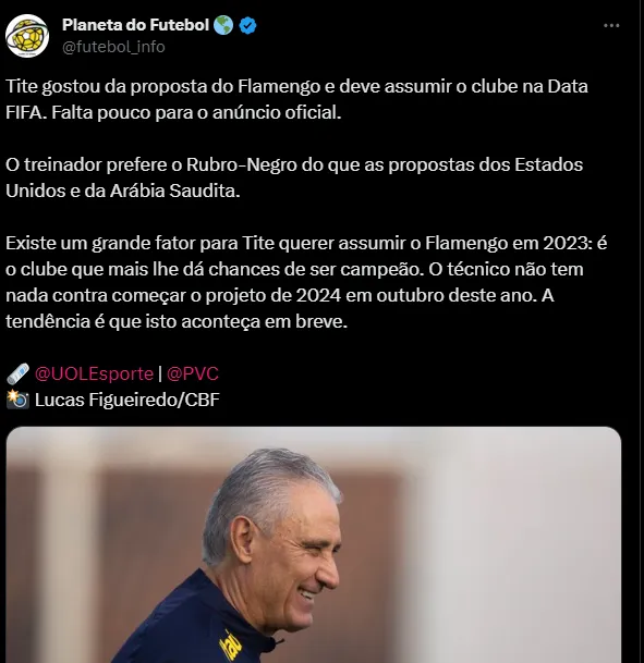 Acontece que a diretoria do Flamengo deseja que Tite fique responsável pelo planejamento adiantado da temporada de 2024. Após um ano desastroso e que pode terminar sem títulos, visto a distância do Flamengo para o líder Botafogo no Brasileirão, reformulação é a principal ideia do Clube para o próximo ano. E, para a cúpula rubro-negra, Tite é a chave mais importante para esse processo de transformação.