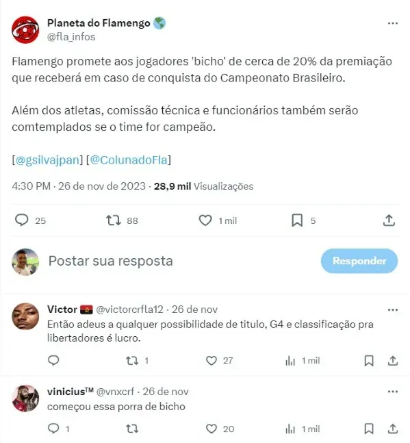 Segundo informações do Coluna do Fla, em matéria do jornalista Guilherme Silva, o Flamengo promete aos jogadores um ‘bicho’ gordo que vai motivar os atleta.