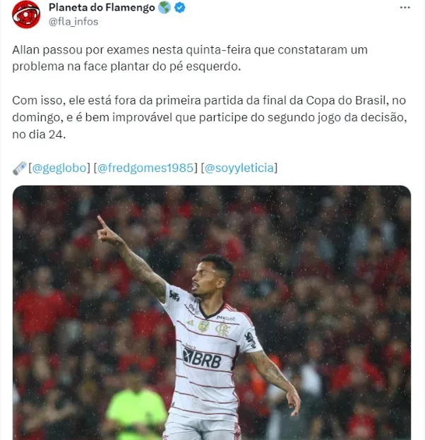 De acordo com informações do portal GE, na tarde desta quinta-feira (14), Allan sofreu uma lesão no pé esquerdo e está fora do jogo entre Flamengo e São Paulo no Estádio do Maracanã, pela final da Copa do Brasil, que acontece no próximo domingo (17), às 16h (horário de Brasília).