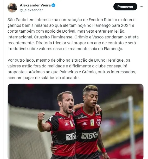 São Paulo tem interesse na contratação de Everton Ribeiro e oferece ganhos bem similares ao que ele tem hoje no Flamengo para 2024 e conta também com apoio de Dorival, mas veta entrar em leilão. Internacional, Cruzeiro, Fluminense, Grêmio e Vasco sondaram o atleta recentemente. Diretoria tricolor vai propor um ano de contrato e será irredutível sobre valores caso ele realmente saia do Flamengo. Por outro lado, mesmo de olho na situação de Bruno Henrique, os valores estão fora da realidade e dificilmente o clube conseguirá propostas próximas ao que Palmeiras e Grêmio, outros interessados, acenam pagar de salários ao atacante.