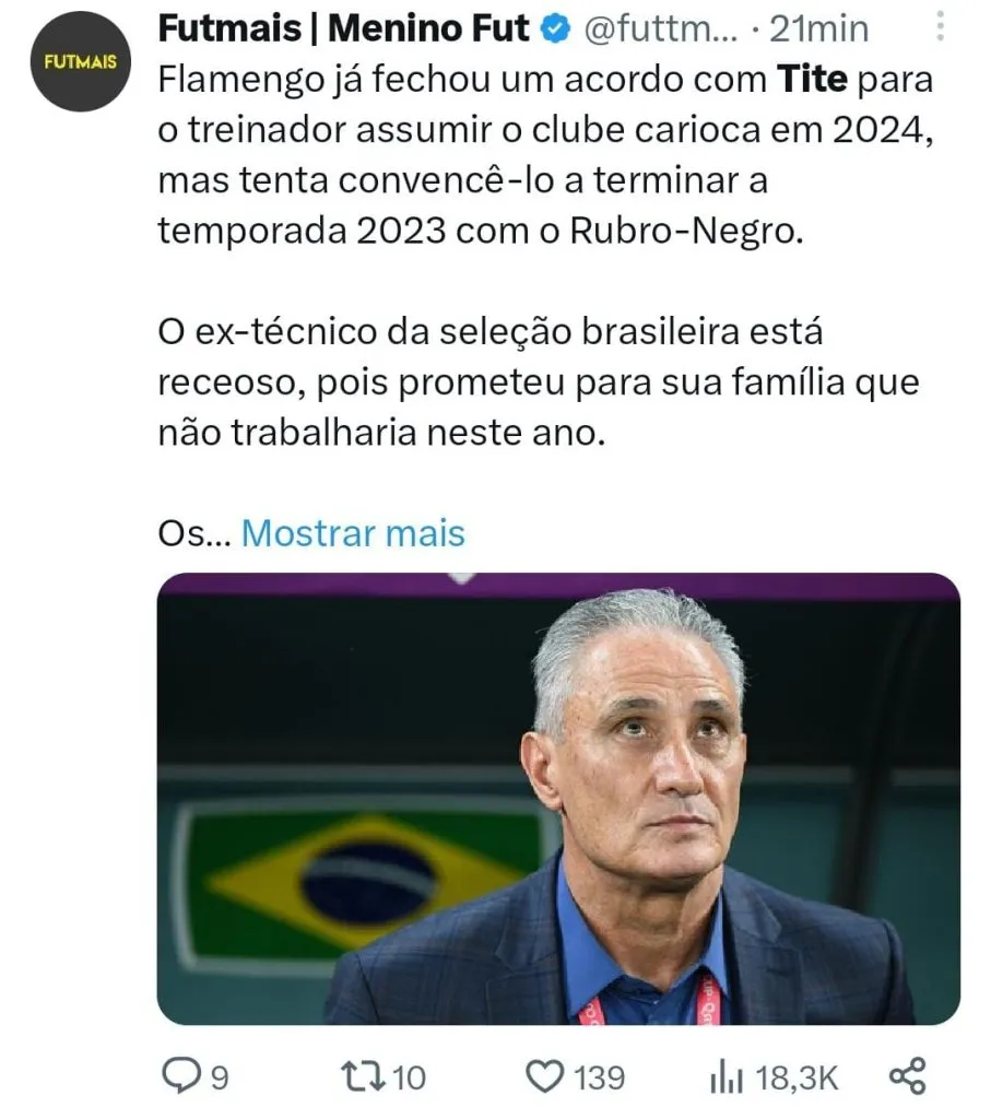 “Acho que é o Tite é uma boa solução para o Flamengo, pelo trabalho da história dele, da história recente, saiu da Seleção Brasileira e está indo para o Flamengo, mas até o Tite vai sofrer no Flamengo o mesmo tipo de questionamento.”, avaliou o jornalista durante o podcast De Primeira.