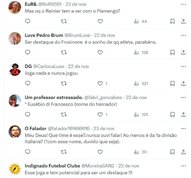 “Mas, quando veio o Frosinone, a gente sabia que era um time com muitos jogadores jovens, uma equipe na qual o técnico gosta muito de trabalhar com jovens e usa muito. Então, quando veio a procura deles, a gente sabia que podia dar certo”, disse Reinier.