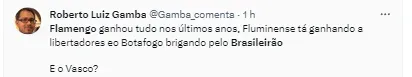 “Não é o Botafogo perder o título, o Flamengo vai ajudar muito o Botafogo para ele poder ir para a Libertadores. O divisor de águas para o Botafogo, mesmo estando mal, é o Flamengo. Acho que o Flamengo vai fazer um servicinho para ele. Se ele não ajudar, nem vai para a Libertadores”, continuou.