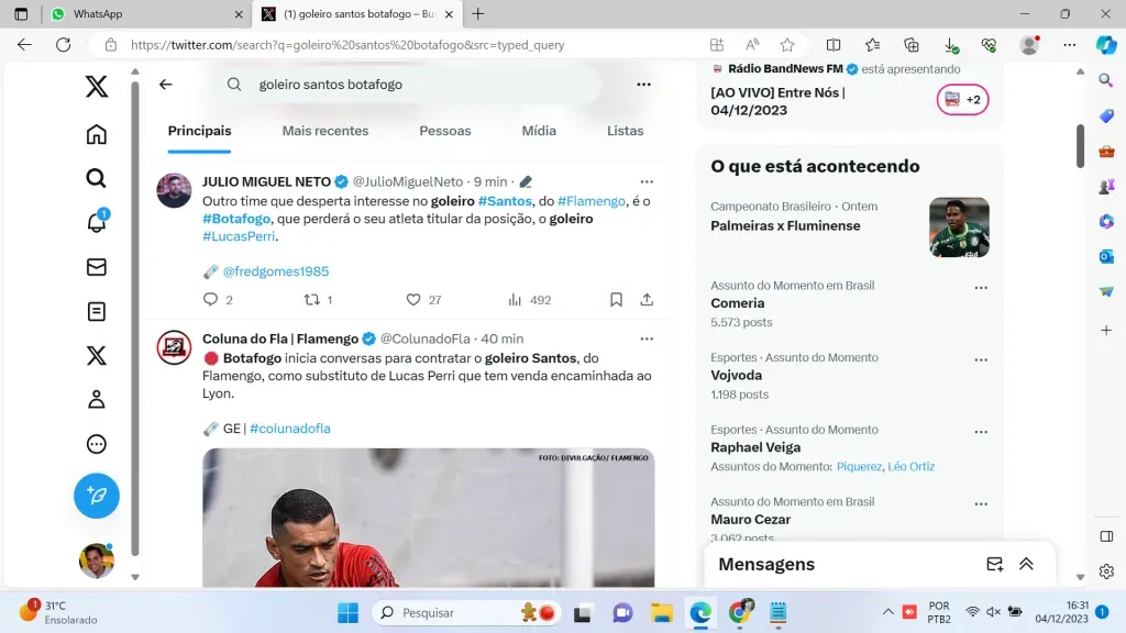Reportagem dos setoristas Fred Gomes e Cahê Mora, do Globo Esporte, informa que o rival Botafogo consultou a situação do goleiro Santos, sem espaço no Flamengo. Ele foi indicado pelo técnico Tiago Nunes.