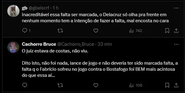“O mesmo VAR que a uma semana ignorou um contato no Fabrício Bruno na mesma intensidade. Ou é falta nos dois, ou em nenhum“, é a opinião de um torcedor do Flamengo.