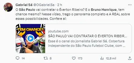 “Então assim, a chance dele pintar no São Paulo de 1 a 10 é 0,5, muito baixa a chance. Obviamente o São Paulo tem interesse e pode sim apresentar uma proposta e tentar entrar na briga, mas é muito improvável, não deve pintar no Tricolor, embora haja esse interesse”, finalizou Gabriel Sá.