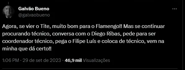 “Agora, se vier o Tite, muito bom para o Flamengo!! Mas se continuar procurando técnico, conversa com o Diego Ribas, pede para ser coordenador técnico, pega o Filipe Luís e coloca de técnico, vem na minha que dá certo!! E a diretoria do Flamengo? Que coisa! Eu li que foram R$ 43 milhões em multas contratuais que o Flamengo pagou nos últimos 2 ou 3 anos! É um absurdo!”, escreveu Galvão.