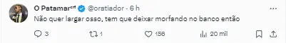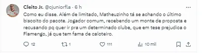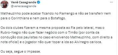 “Mas o Rubro-Negro não quer fazer negócio com o Timão (por conta da condução dos paulistas no caso envolvendo Matheuzinho, com direito a nota oficial) e o jogador não quer topar a ida ao Alvinegro carioca. Ou seja, segue o impasse”, completou o jornalista.