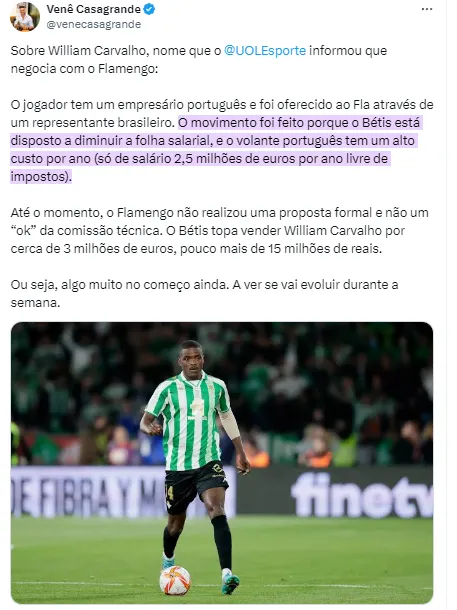 “O jogador tem um empresário português e foi oferecido ao Fla através de um representante brasileiro. O movimento foi feito porque o Bétis está disposto a diminuir a folha salarial, e o volante português tem um alto custo por ano (só de salário 2,5 milhões de euros por ano livre de impostos)”, revelou o jornalista.