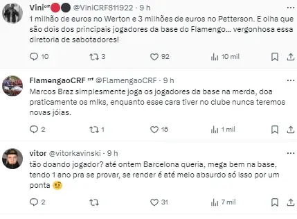 “1 milhão de euros no Werton e 3 milhões de euros no Petterson. E olha que são dois dos principais jogadores da base do Flamengo… vergonhosa essa diretoria de sabotadores”, detonou um torcedor nas redes sociais.