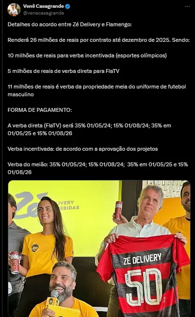 Venê Casagrande confirmou os valores e o tempo de contrato entre as partes envolvidas, detalhando os bastidores do negócio. “Detalhes do acordo entre Zé Delivery e Flamengo: Renderá R$ 26 milhões por contrato até dezembro de 2025”, informou o jornalista.