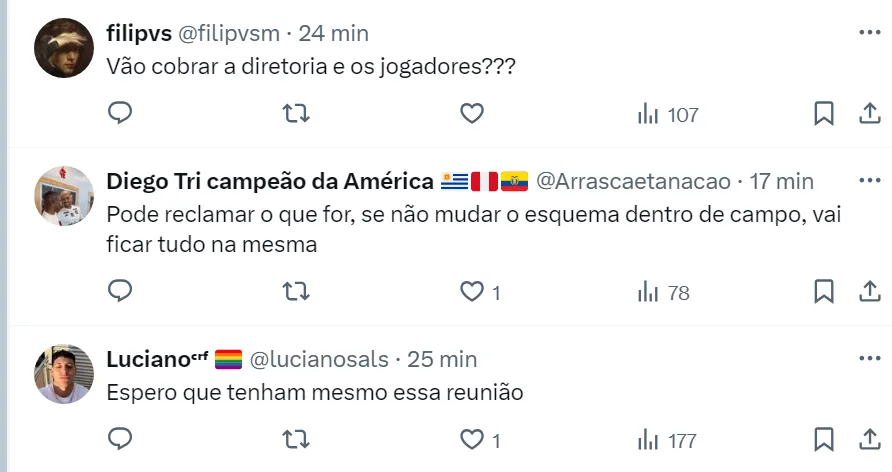 No entanto, Landim e Braz não estão satisfeitos com o desempenho da equipe e terá uma conversa com o técnico: “Informação que eu tenho é que ele não balança neste momento, mas a diretoria vai cobrar o Tite”, explicou o repórter em seu canal no Youtube.