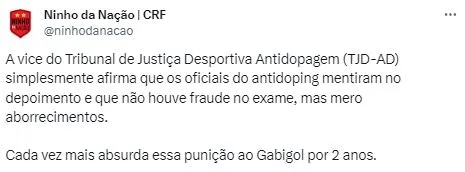 Mas, o outro lado da moeda também traz apontamentos perturbadores sobre uma possível injustiça cometida sobre o atacante. É o que destaca a vice-presidente do Tribunal de Justiça Desportiva Antidopagem (TJD-AD), Selma Fátima Melo Rocha em seu relatório que defendia a absolvição do jogador.