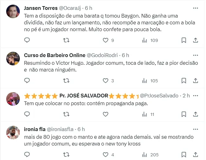 Victor Hugo estreou na era Tite na última partida, quando o Flamengo foi derrotado pelo Santos no Estádio Mané Garrincha, em Brasília. O meia do clube rubro-negro atuou por 45 minutos.