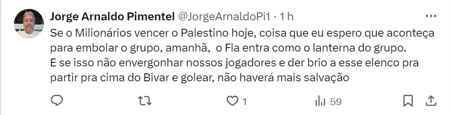 Em caso de empate no Maracanã, o Flamengo vai se complicar na fase de grupos da Copa Libertadores. O líder da chave é o Bolívar, com nove pontos, o Palestino vem em segundo lugar, com seis somados.