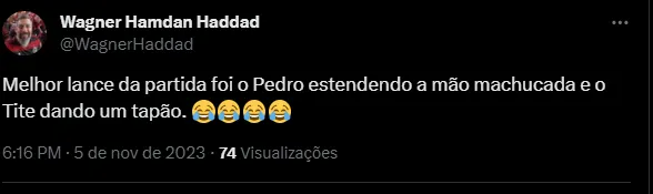 “Melhor lance da partida foi o Pedro estendendo a mão machucada e o Tite dando um tapão”, “Tite é o Flamengo de 2023 e a mão do Pedro é a torcida” e “Hahaha. Comissão vem comissão vai, o maluco só apanha”, foram os comentários.