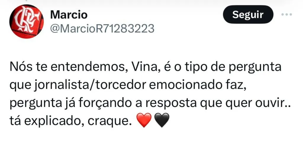 “Nós te entendemos, Vina, é o tipo de pergunta que jornalista/torcedor emocionado faz, pergunta já forçando a resposta que quer ouvir.. tá explicado, craque”, afirmou um internauta flamenguista.