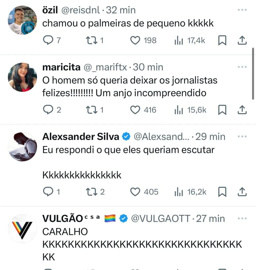 “Chamou o Palmeiras de pequeno”. Disse um torcedor. “Foi direto demais. Esse merece meu respeito. Deitou na torcida do Palmeiras”, brincou um membro da torcida.