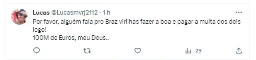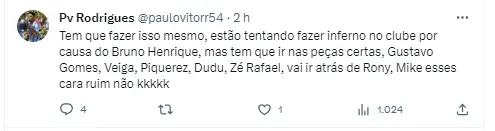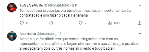 Porém, o Flamengo não deve trazer ambos, deve focar em apenas um deles. Uma fonte ligada ao Clube Carioca teria confirmado que a equipe tentará trazer um deles e criticou Leila Pereira, presidente da equipe rival: “Essa Leila não respeita o próprio clube, a própria torcida. É vascaína, nunca foi Palmeiras, agora veio fazer leilão e atrapalhar nossa renovação com BH. Se fosse a gente, estariam chamando a gente de tudo. Absurdo o que o Leila está fazendo. Vamos lá também tentar tirar alguém, mas dessa vez vamos mais forte do que fomos quando quisemos o Dudu”, disse.