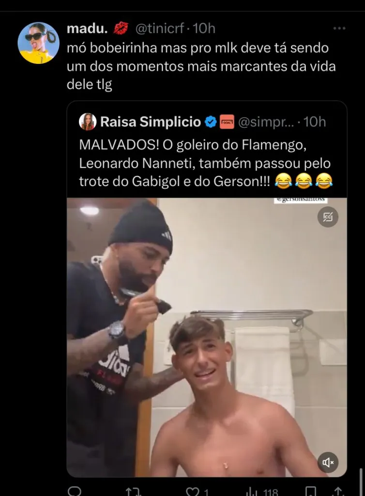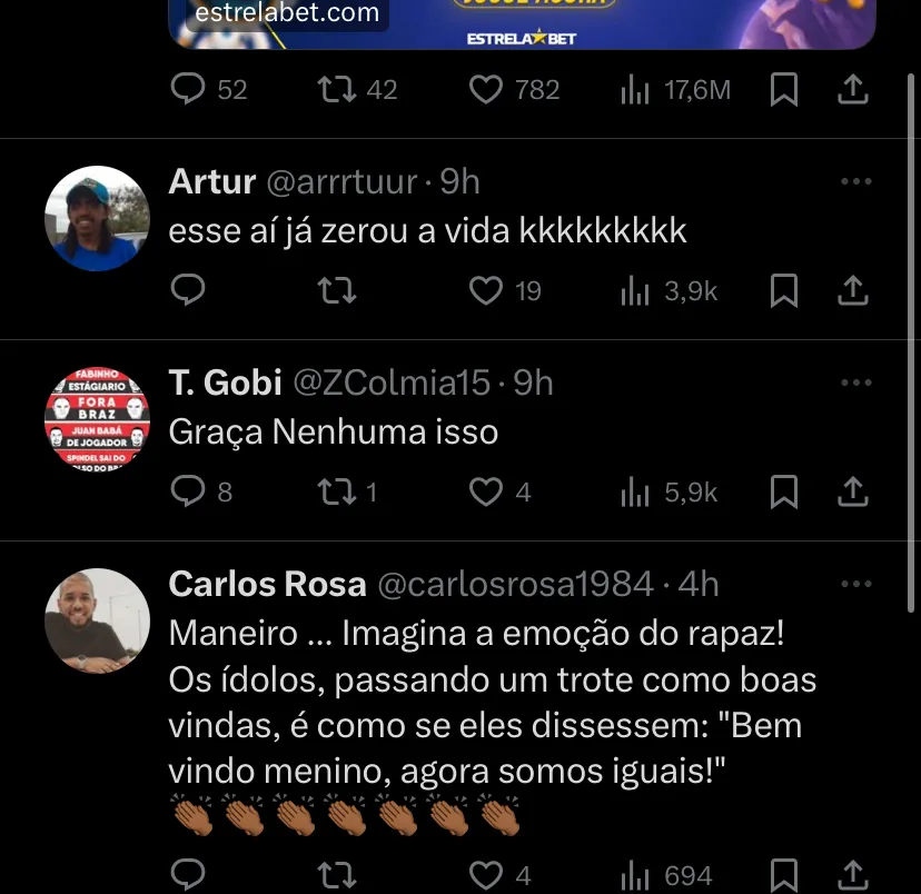 (SIC): “Esse aí zerou a vida”; “Maneiro, imagina a emoção do rapaz? Os ídolos passando um trote de boas vindas. É como se eles dissessem: ‘bem-vindo, agora somos iguais!”; “Gabriel voltando a fazer gracinha, voltaremos”, foram alguns comentários da torcida do Flamengo.