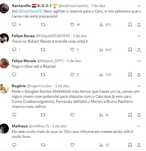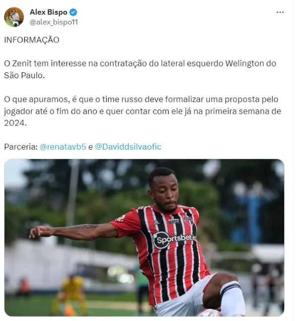 “O que apuramos, é que o time russo deve formalizar uma proposta pelo jogador até o fim do ano e quer contar com ele já na primeira semana de 2024”, afirmou Alex Bispo, que cobre o Tricolor Paulista.