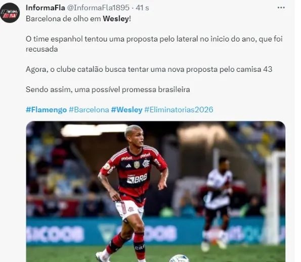 Um dos principais jogadores do Flamengo na temporada, Wesley atrai interesse de clubes do futebol europeu há algum tempo. Barcelona já enviou uma oferta, mas foi recusada pelo Rubro-Negro.