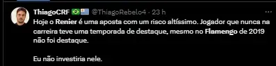 “É uma boa, muito boa para o Reinier, é bem melhor para o Reinier. Ele vai ajudar muito, mas assim… pensar ali no que o Flamengo tem no meio, está necessitando, precisa urgentemente? Não, mas é bem-vindo, é mais uma opção, mas não chega para ser titular no início”, opinou Zinho.