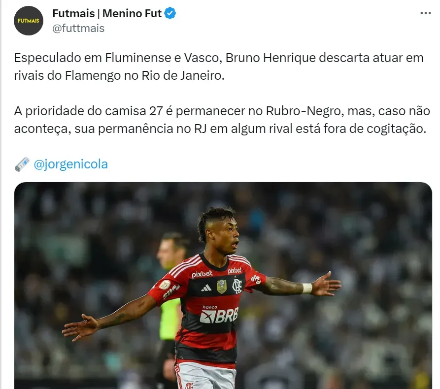 “O Bruno Henrique já pediu para Denis Ricardo, que é seu representante, que não negocie com Fluminense e Vasco. Bruno Henrique tem enorme respeito e carinho pelo Flamengo, ele vai dar prioridade de continuar no Flamengo. Se não rolar de continuar no Flamengo, ele não vai trocar o Flamengo por um rival da cidade Rio de Janeiro. Por respeito ao Flamengo, ao torcedor, mas também por preocupação em relação à sua família”, disse Nicola em seu canal no Youtube.