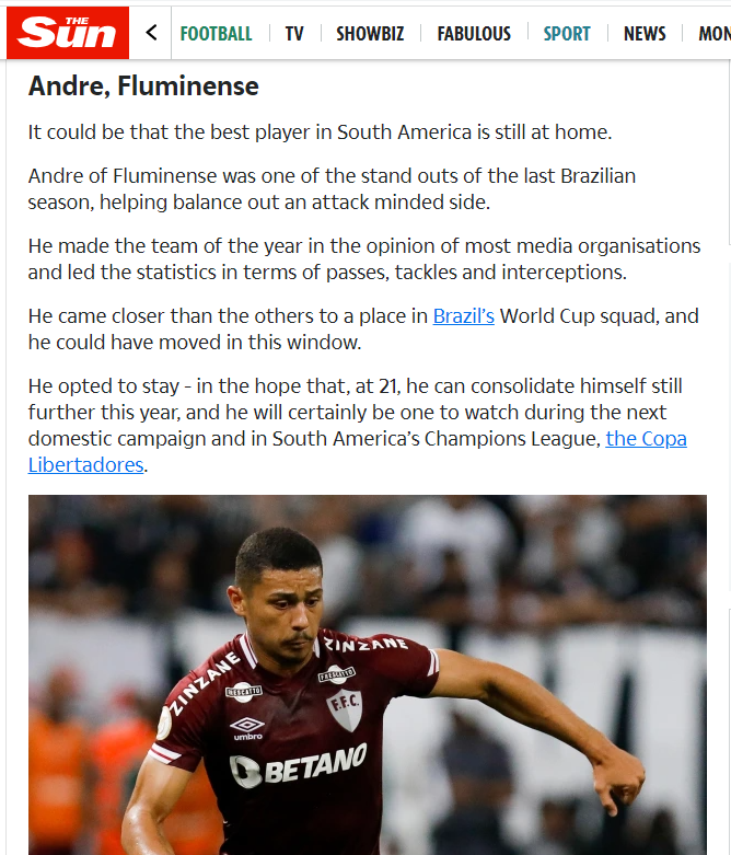 O jornal inglês não teve medo de polêmica ao apontar que André tinha potencial para atuar na última Copa do Mundo, pela Seleção Brasileira e que sua transferência já poderia ter acontecido na última janela de transferência na Europa. Entretanto, o The Sun afirma que o jogador preferiu permanecer no Flu para pegar mais força e que durante a “Champions League da América do Sul”, no caso a Libertadores, o volante formado em Xerém estará sob forte observação de potenciais novos destinos do jogador no futebol internacional.