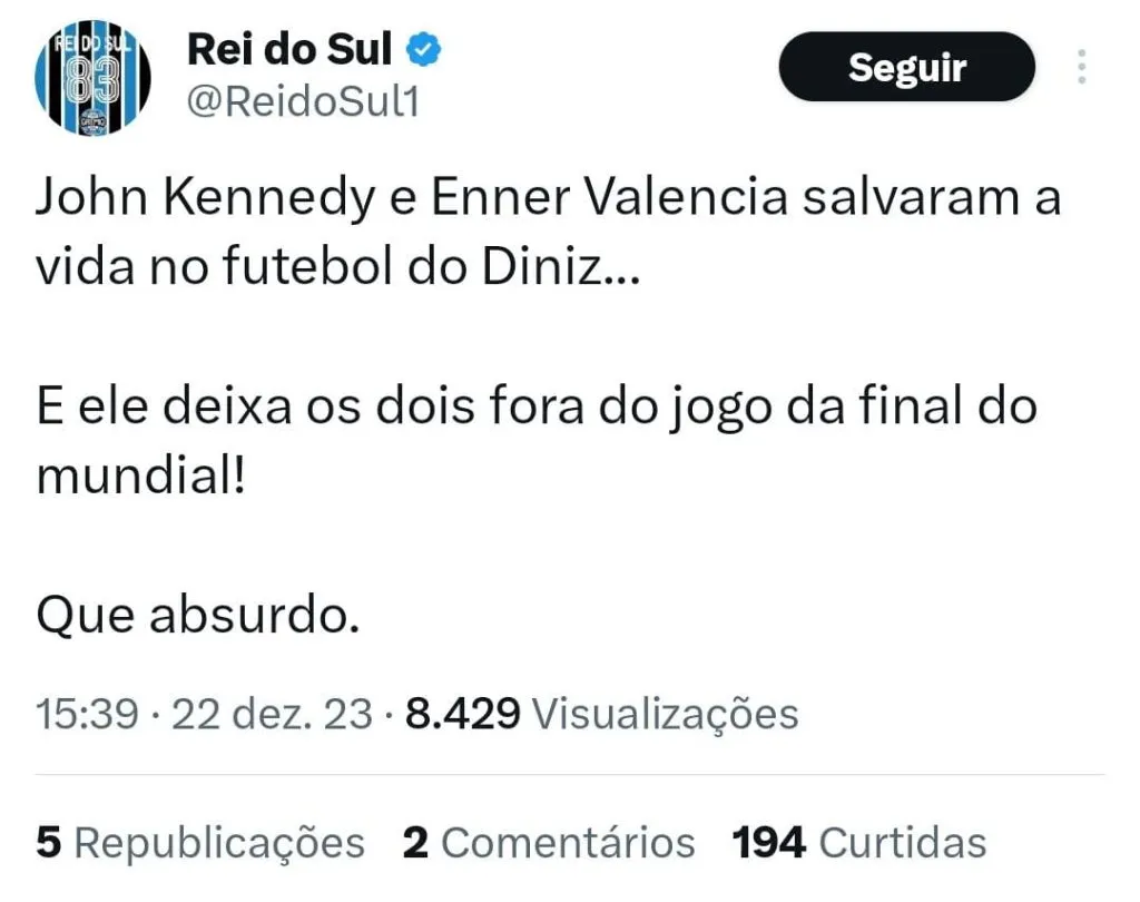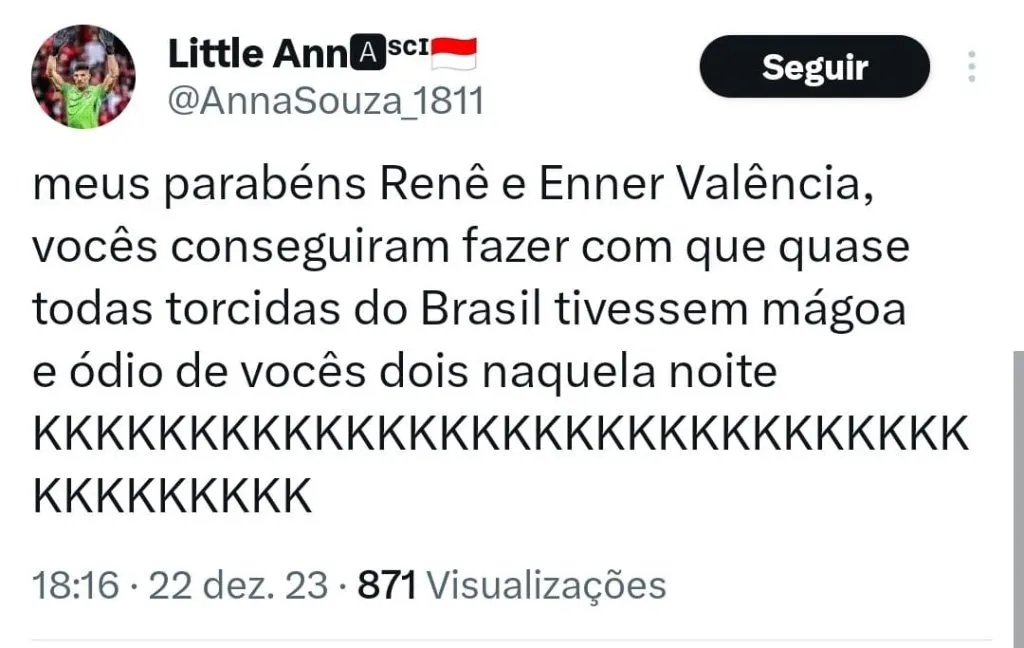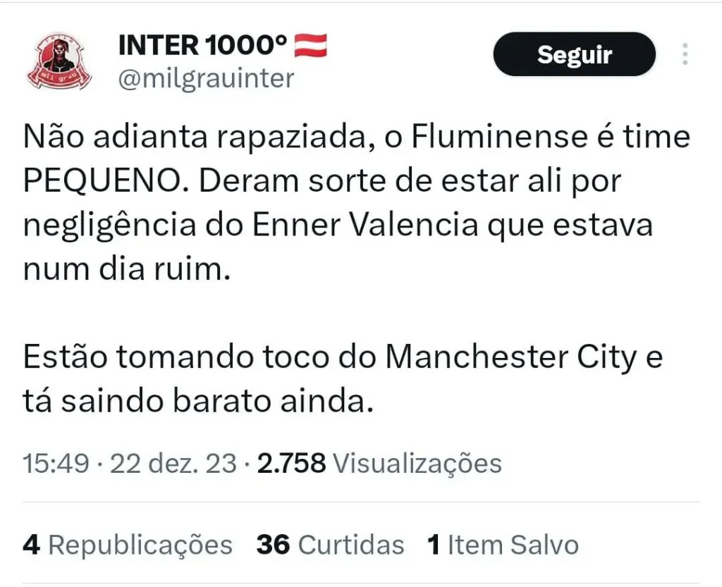 “Lembrando que o Fluminense só foi jogar esse torneio aí porque o vagabundo do Enner Valencia perdeu dois gols que um cadeirante faria. 👍🏼”, avaliou um rival.