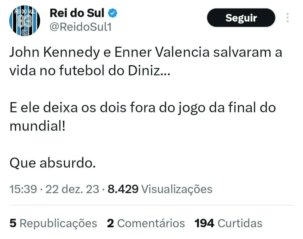 “A América do Sul está passando vergonha por sua culpa, Enner Valencia.”, disse um internauta. “Vamos ser sinceros? Se não fosse o Enner Valencia o Fluminense nem estaria ai”, concordou outro.