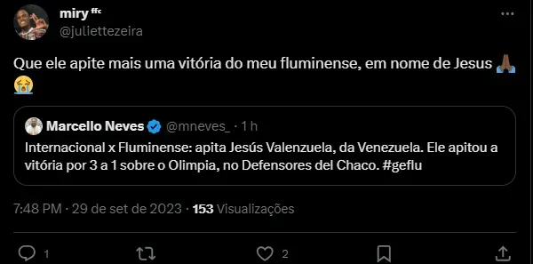 “É um forte sinal, seremos”, “Ele é pé quente”, “Que ele apite mais uma vitória do meu Fluminense, em nome de Jesus”, “Sinais… o metafísico está agindo” e “Sinais… Obrigado metafísico”, foram alguns dos cometários deixados pelos tricolores, acreditando em mais uma vitória do Fluminense, mantendo a ‘sina’ do árbitro venezuelano.