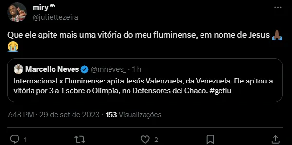 É um forte sinal, seremos”, “Ele é pé quente”, “Que ele apite mais uma vitória do meu Fluminense, em nome de Jesus”, “Sinais… o metafísico está agindo” e “Sinais… Obrigado metafísico”, foram alguns dos cometários deixados pelos tricolores, acreditando em mais uma vitória do Fluminense, mantendo a ‘sina’ do árbitro venezuelano.