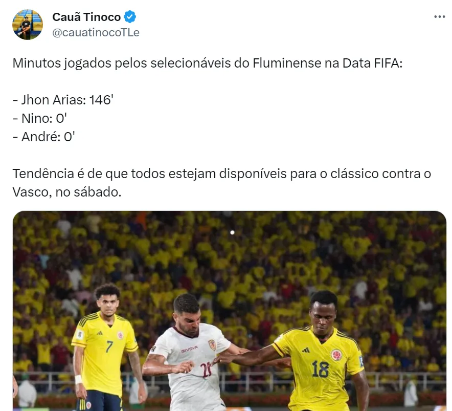 Mas o saldo acabou sendo positivo para o time do Fluminense: Arias foi titular nos dois jogos por sua seleção e atuou em 146 minutos, como informou o jornalista Cauá Tinoco. Já pelo Brasil, Fernando Diniz não utilizou o zagueiro Nino e o volante André na Data Fifa. Com isso, o trio passou ileso de lesões e deve enfrentar o Vasco no sábado (16).