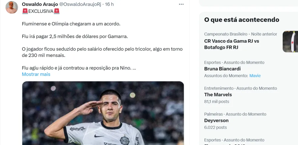 O colega Oswaldo Araújo, da Rádio Transamérica, informou que o Fluminense chegou a um acerto com o Olimpia, do Paraguai, pela contratação de Mateo Gamarra.