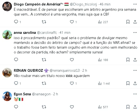 O colombiano recorreu ao VAR durante o lance, porém, em virtude dessa decisão, a conversa com a cabine não será tornada pública.