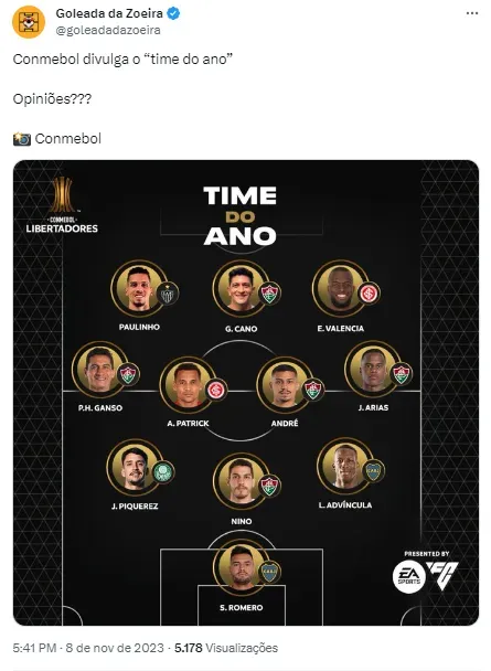 Com cinco representantes do Fluminense, a Conmebol provou que o futebol brasileiro segue hegemônico no continente sul-americano. Nino, André, Ganso, Arias e Cano marcaram presença na escalação dos melhores atletas da Libertadores na temporada.