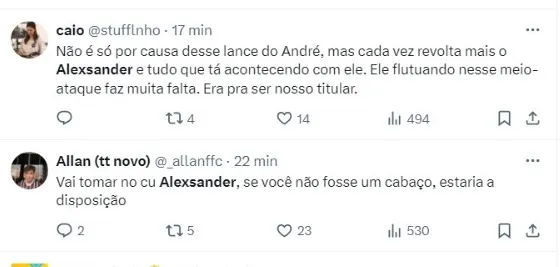 “A merda que o Alexsander arrumou aí, podia entrar no lugar do André agora, dependendo da gravidade da lesão talvez seria titular por um tempo, mas preferiu jogar a chance fora, tem que tomar no olho do c* mesmo“, completou outro torcedor.