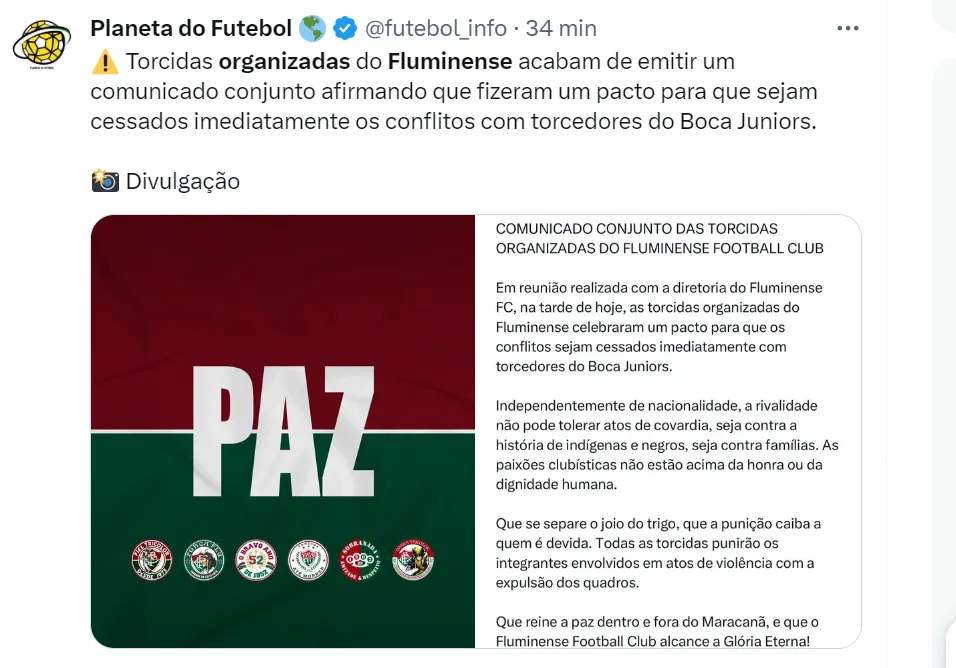 As torcidas organizadas do Fluminense celebraram um pacto para que os conflitos sejam cessados imediatamente com torcedores do Boca Juniors. Confira a nota: