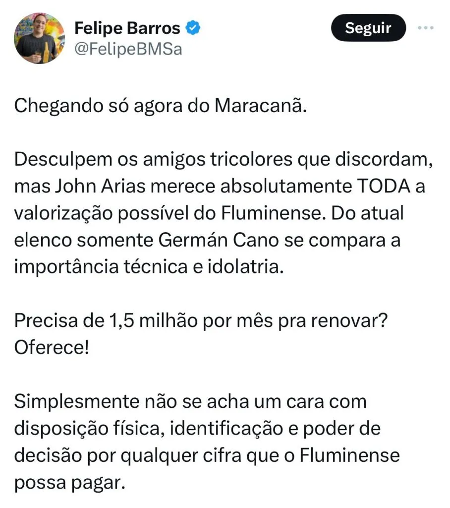 Para bater o Flamengo mais uma vez na competição estadual, o Fluminense contará com o meio-campista John Árias, que vem sendo um dos destaques ao lado de Cano desde 2022. E na tarde da última segunda-feira (4), o torcedor do Tricolor recebeu uma grande notícia.