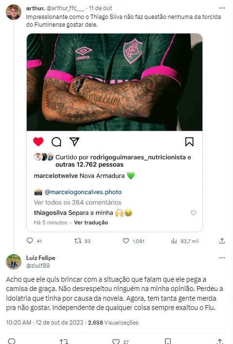 O assunto, que antes pouco tinha a ver com o técnico do Fluminense, agora impacta diretamente Fernando Diniz. Mesmo sem citar diretamente o nome do treinador, Thiago Silva tocou em um assunto que é da competência do comandante do Tricolor. O zagueiro segue em alto nível na Europa e com esperanças de retornar ao Brasil um dia. Seja apenas na Seleção, ou então para realizar o sonho de uma torcida nas Laranjeiras.