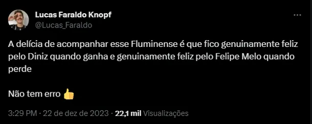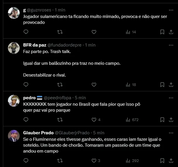 Após o apito final, os nomes de Grealish e Felipe Melo ficaram entre os mais comentados no “X”. Perfis publicaram o momento em que o inglês xingou o brasileiro: “Se o Grealish falou “olé” mesmo….. Meu ídolo GOAT Jack Grealish“, foi um post de uma página referente ao City.