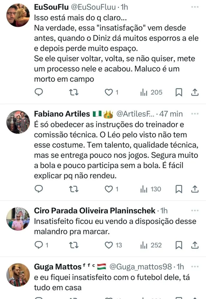A insatisfação de Léo Fernandez com Diniz e a cúpula do Fluminense começou quando o treinador vetou o meia da lista dos 23 inscritos. Para piorar, o jogador se quer viajou com o grupo de apoio para completar os treinos na Arábia Saudita, casos do goleiro Gustavo Ramalho, do zagueiro Felipe Andrade, do meia Giovanni (que até já deixou o clube ao fim do contrato) e do atacante Lelê.
