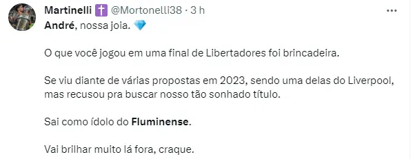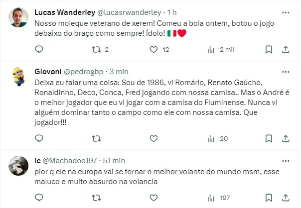 “O Flu também deve negociar nos próximos dias o volante André, alvo de muitas propostas nas últimas janelas. O presidente Mário Bittencourt com o objetivo de brigar pelo título da Libertadores, recusou as ofertas pelo Nino e pelo André. Agora os negócios vão acabar saindo”, disse.