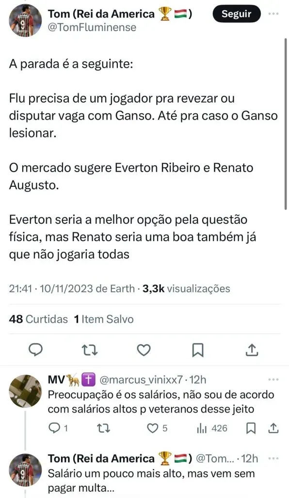 Mário Bittencourt é fã de Everton Ribeiro e em uma entrevista ao Charla Podcast reforçou o desejo de ter o meio-campista no Fluzão em 2024. “Everton admiro muito, não só o jogador, mas o ser humano também. Ele é foda. Se o Flamengo lá na frente não estiver com ele, quem sabe… Já mandei dizer isso para ele (que cairia como uma luva no Fluminense)”, afirmou.