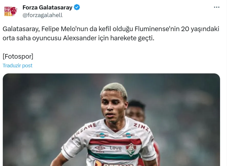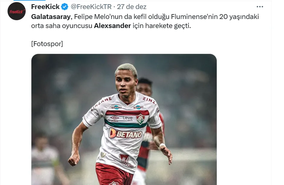 O perfil turco ‘FreeKick’ informa que o clube de Istambul estaria de olho em Alexsander com ‘aval’ de Felipe Melo, que é ídolo no Galatasaray. O Fluminense rechaça qualquer investida dos europeus ao volante.