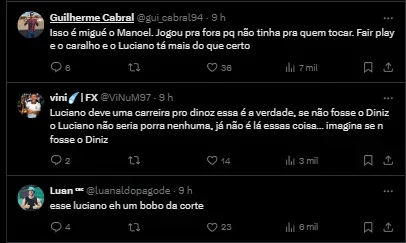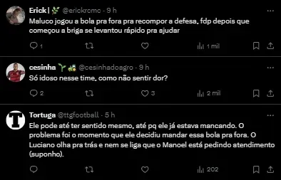 “Sinceramente, não entendi a expulsão. Para mim, deveria ser amarelo. É algo inédito. Sobre o lance, claramente o Manoel sentiu a coxa e pôs a bola para fora. A coisa que era legal, que está na regra, mas era totalmente não legítimo o Luciano cobrar o lateral da forma que ia cobrar”, declarou o técnico.